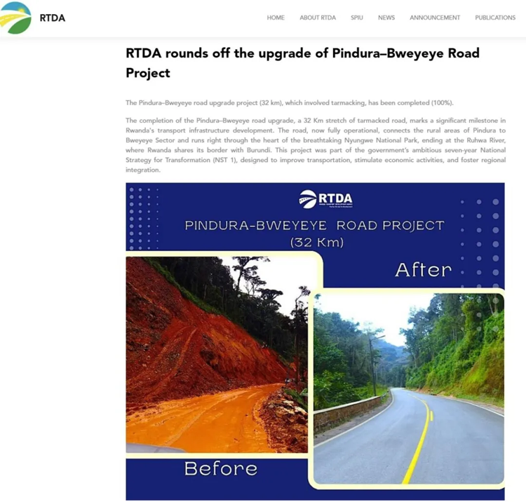 Cette route traverse la forêt de Nyungwe, reliant les communes de Pindura et Bweyeye. Malgré des conditions climatiques difficiles, des défis géologiques complexes et des exigences environnementales strictes, l'équipe du projet est parvenue à surmonter tous les obstacles grâce à son innovation et sa gestion rigoureuse. Ce projet a permis d'améliorer le réseau routier national, de fluidifier la circulation locale et de créer de nouvelles opportunités de développement pour les communautés environnantes. Il est ainsi considéré comme un bel exemple de coexistence harmonieuse entre la construction d'infrastructures, la protection de l'environnement et le développement socio-économique.
