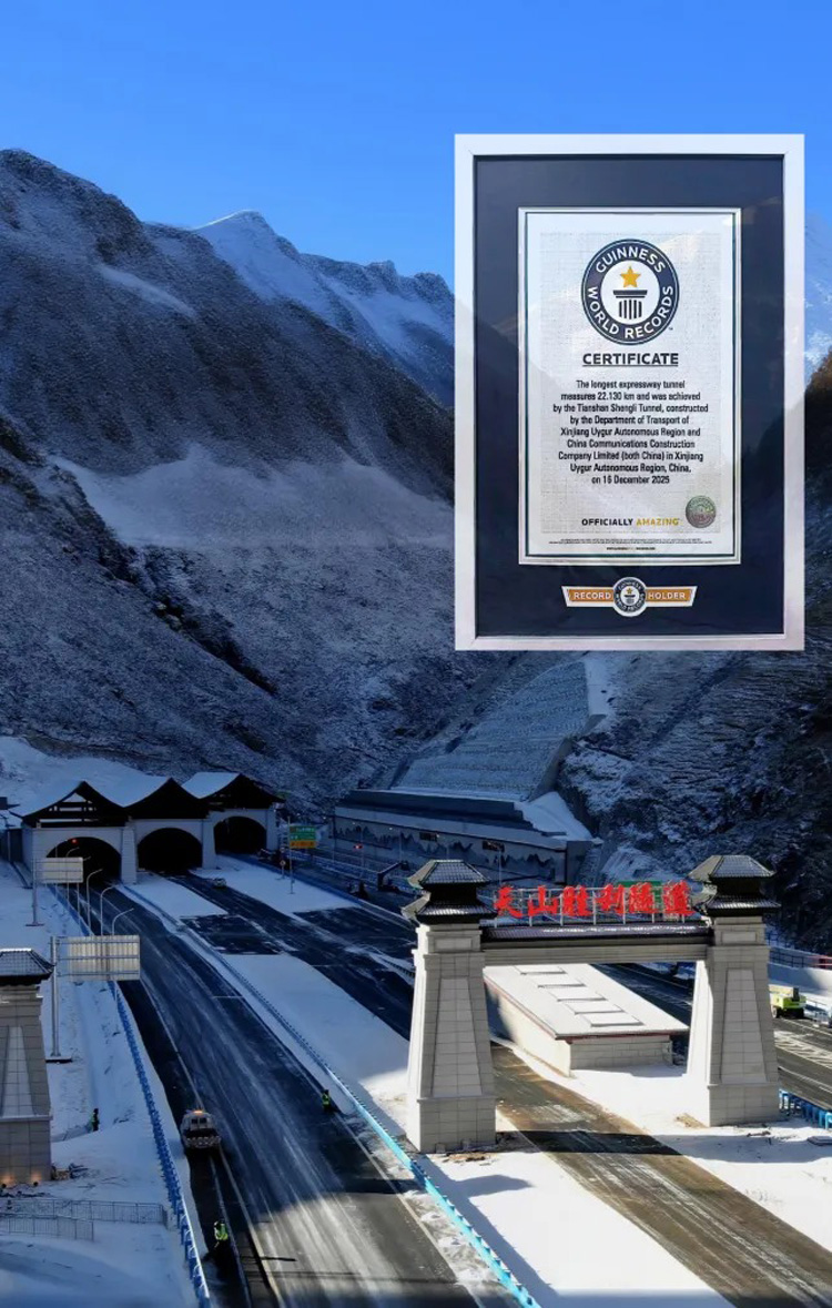 Le tunnel Shengli (« Victoire » en chinois) traversant les monts Tianshan, a été homologué par le Guinness World Records comme le « plus long tunnel routier du monde », avec une longueur de 22,13 kilomètres pour un tube. Il constitue une partie cruciale de l'autoroute Urumqi–Yuli, un projet financé, construit et exploité par CCCC. Cette reconnaissance met en lumière le savoir-faire de pointe et l'expertise de CCCC dans la réalisation de tunnels ultra-longs dans des conditions géologiques complexes, à haute altitude et sous un climat extrêmement rigoureux.