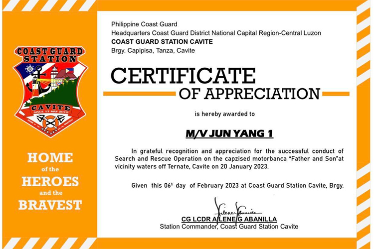 Le 20 janvier, la drague « JY1 » a trouvé dans sa zone de travail quatre pêcheurs tombés à l'eau en raison du naufrage de leur bateau de pêche. Le capitaine a immédiatement ordonné à l'équipage de s'approcher des naufragés pour leur porter secours. Finalement ces quatre personnes qui avaient dérivé en mer depuis deux jours et une nuit ont été sauvées. Le capitaine leur a offert des couvertures, des vêtements, de l'eau chaude, des biscuits et d'autres produits de nécessité, et a demandé au médecin à bord de procéder à un contrôle médical des naufragés. Par la suite, l'équipe de CCCC a organisé leur transport par bateau à l'embarcadère de Pasay et puis leur retour en voiture à Cative.